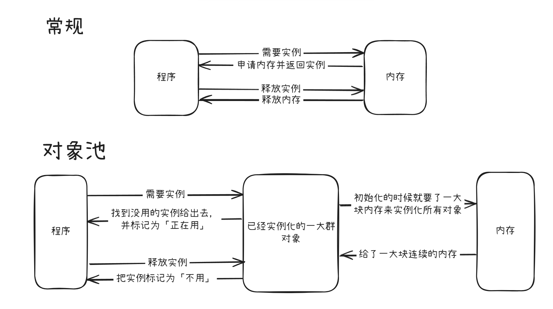 对象池的解决方法是通过一个「缓存」来提前存储需要用的实例,在需要的时候从缓存中「取出」,使用结束后再「存回」对象池中。